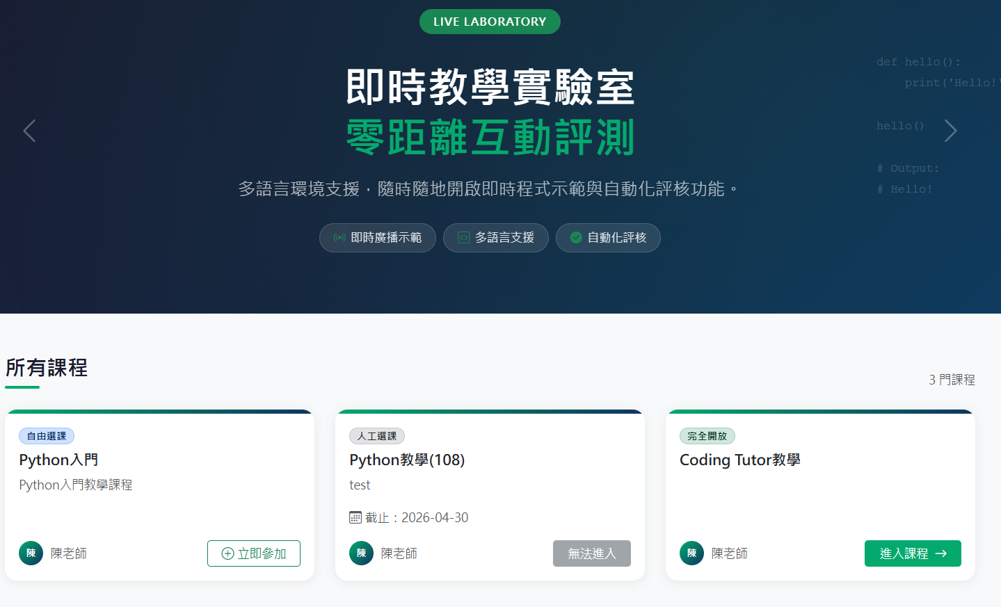 登入後在系統首頁,可看到目前的課程列表,課程類型有三種: