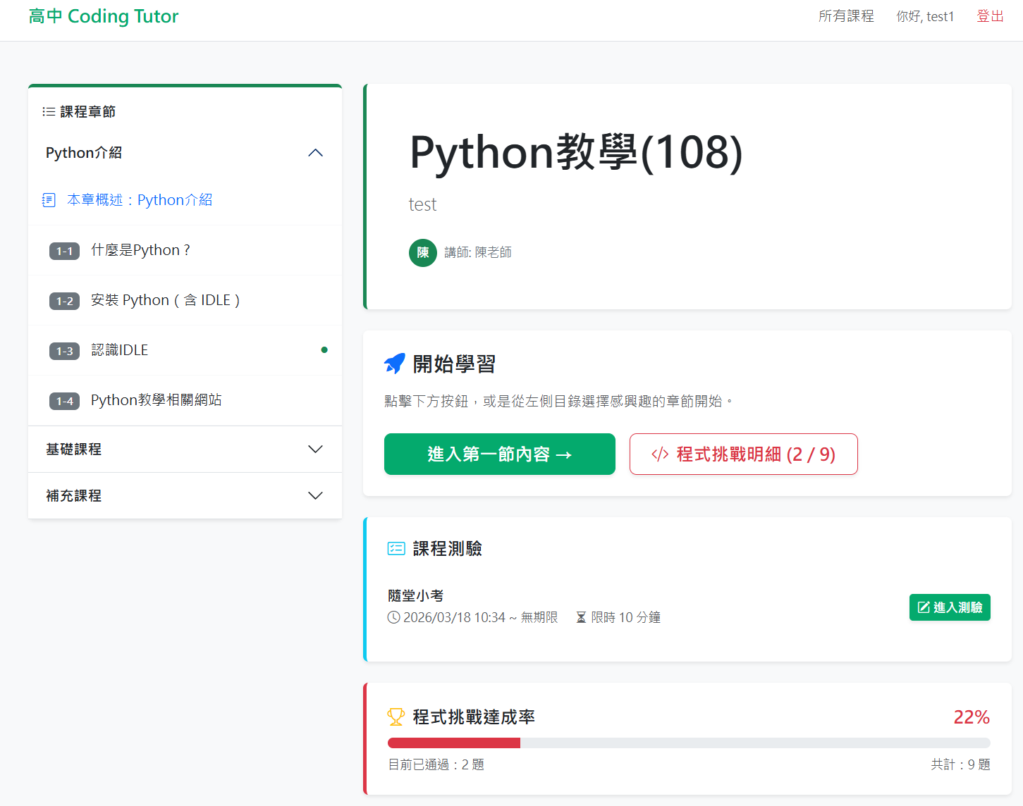 進入課程首頁,左方可看到課程的章節,右邊則會列出目前程式挑戰的明細及挑戰進度,若該課程有測驗,亦會在右側的「課程測驗」中列出。