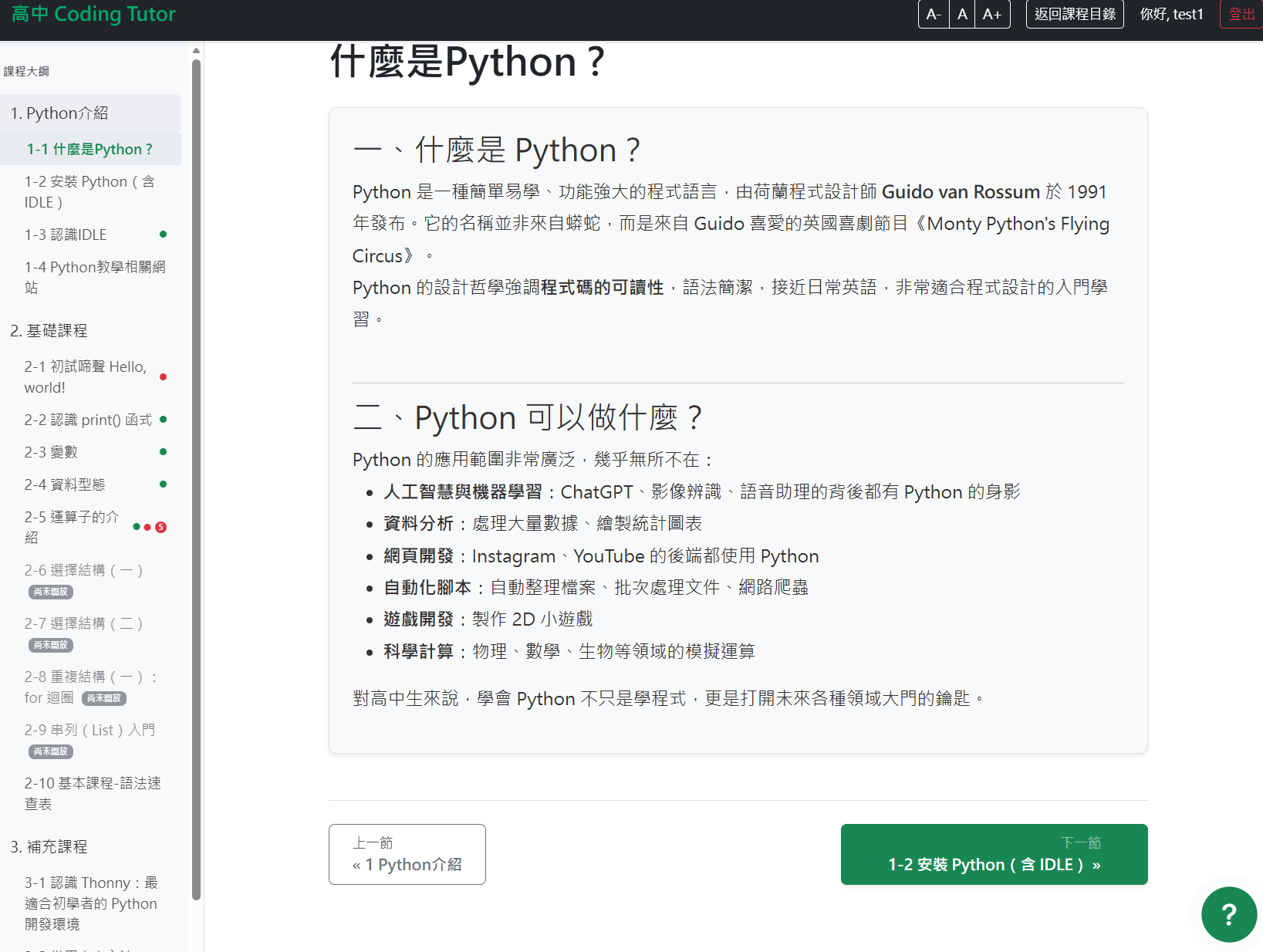 點選左方的課程章節,或是按下「進入第一節內容」按鈕,即可進入課文開始閱讀。左側會列出章節的內容,右側則是課文,底部可切換到上/下章節。