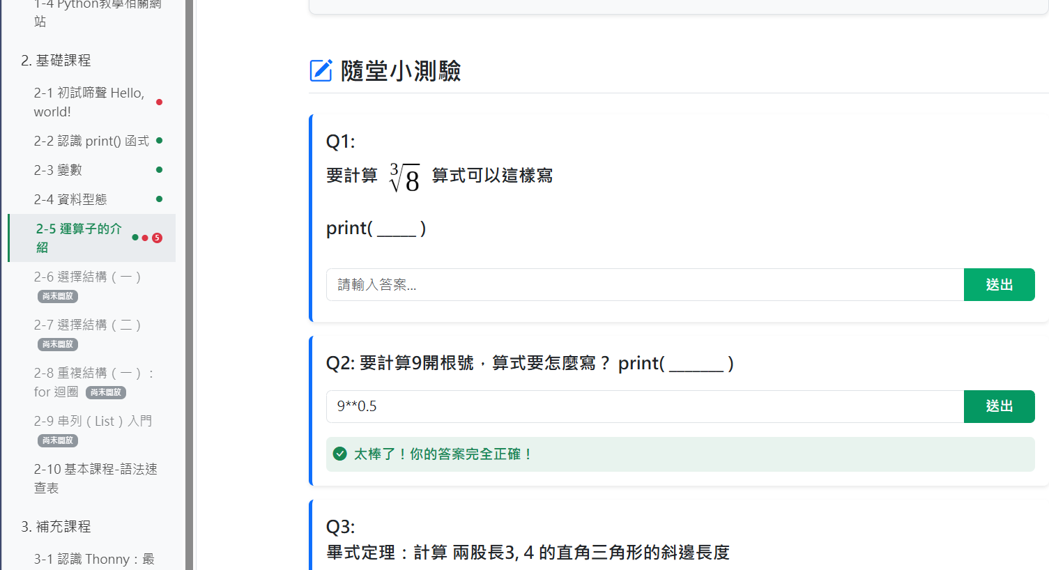 左側的章節列表中,右邊有綠色圓圈代表該章節有隨堂測驗(單選/多選/填充)或牛刀小試,可以自由填寫作答(不計算成績),系統會自動判斷是否正確。