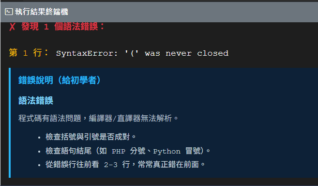 - 語法檢查:檢查程式碼是否有語法的錯誤,並提供中文解說及可能的錯誤原因。