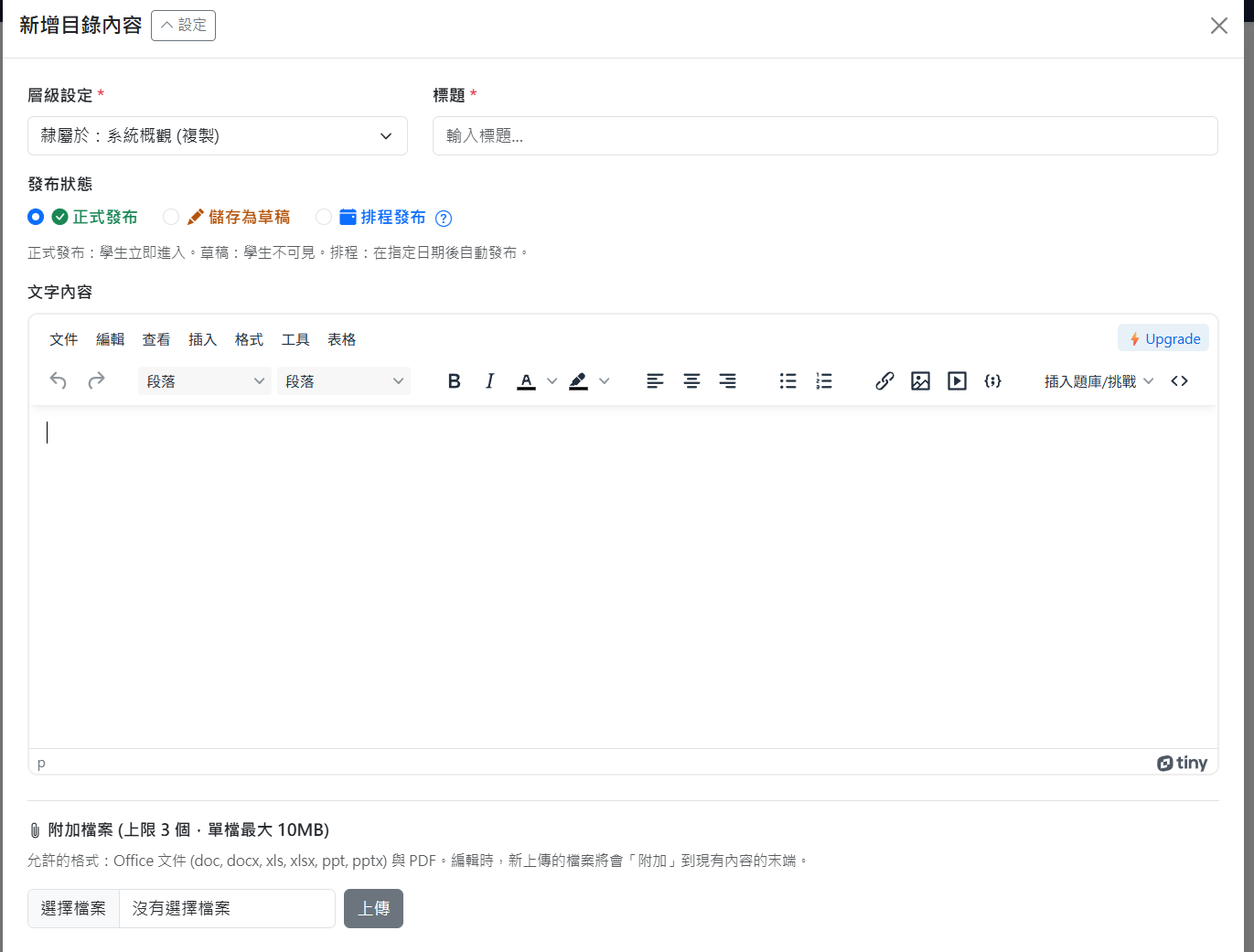 - 儲存為草稿:除了教師之外,學生無法查看(在左側的章節選單也看不到)